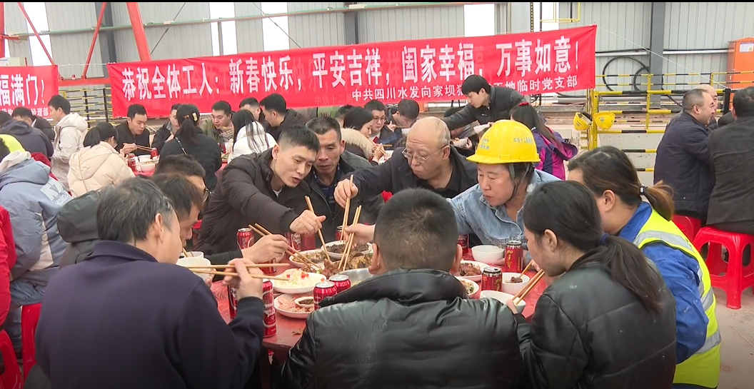 向家壩灌區(qū)北總干渠一期一步貓兒沱江底隧洞的施工現(xiàn)場,機器轟鳴,運輸車輛往來穿梭,現(xiàn)場一片忙碌景象。貓兒沱江底隧洞作為一期工程的控制性重難點工程,百余名建設者春節(jié)期間堅守工作崗位,只為順利穿越岷江江底,確保按期貫通。1月31日,正值大年三十,為了讓建設者們過上一個舒心的新年,項目部特意為來自五湖四海的建設者們準備了一場充滿濃濃年味的壩壩宴,糖醋鯉魚、梅菜扣肉、紅燒雞……一盤盤具有年味兒的菜肴依次上桌,工地上的團年飯就此展開,大家一起吃團年飯,迎接虎年的到來。
