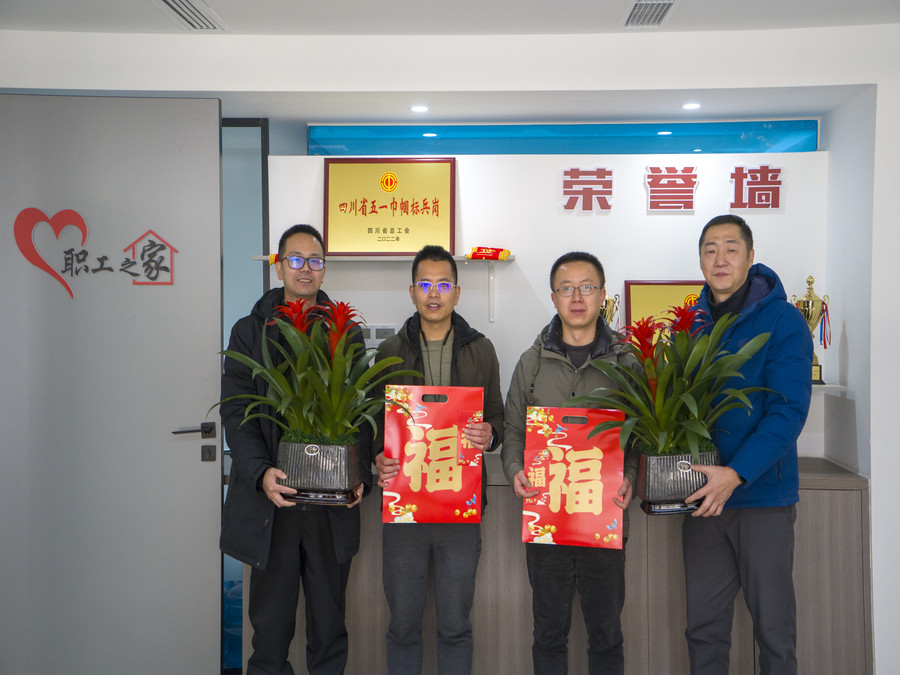 1月18日,成都市青羊區(qū)草堂街道總工會副主席葉兵慰問公司“青羊工匠”唐全民、陳昌盛。