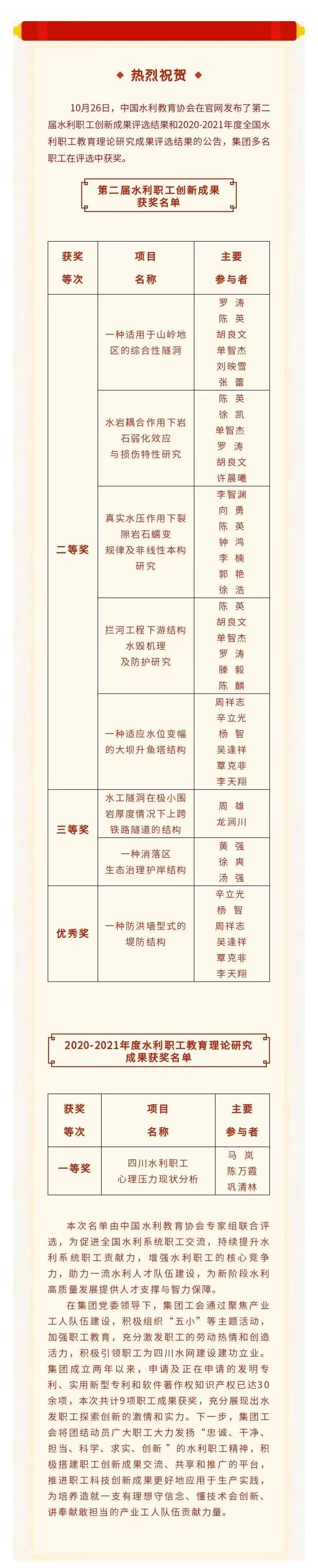 喜報(bào)!集團(tuán)在第二屆水利職工創(chuàng)新成果獲獎(jiǎng)名單和2020-2021年度水利職工教育理論研究成果獲獎(jiǎng)名單出爐