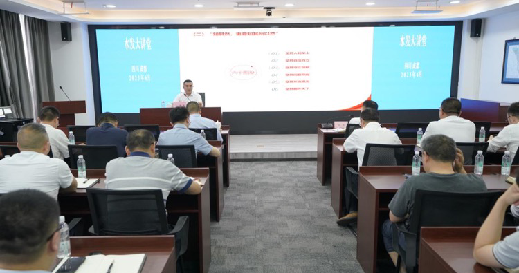 自今年6月以來(lái),水發(fā)集團(tuán)在落實(shí)水利廳“學(xué)思想見行動(dòng) 做新時(shí)代水利人”主題活動(dòng)中,緊扣主題教育各項(xiàng)要求,聯(lián)系集團(tuán)實(shí)際,創(chuàng)新啟動(dòng)了主題教育1+7“水發(fā)大講堂”。集團(tuán)黨委精心謀劃,集團(tuán)領(lǐng)導(dǎo)率先垂范,以集團(tuán)黨委為中心,集團(tuán)黨委書記、董事長(zhǎng)鐘杰以《銘記光輝歷史 堅(jiān)守初心使命 矢志擔(dān)當(dāng)作為 建設(shè)四川水網(wǎng)》為題講授專題黨課,從銘記光輝歷史、不忘走過(guò)的路,堅(jiān)守初心使命、堅(jiān)定前行的路和矢志擔(dān)當(dāng)作為、走好腳下的路三個(gè)方面系統(tǒng)地闡述了集團(tuán)成立至今的發(fā)展歷程,推動(dòng)跨越發(fā)展全面崛起,實(shí)現(xiàn)集團(tuán)關(guān)鍵之年高質(zhì)量發(fā)展。