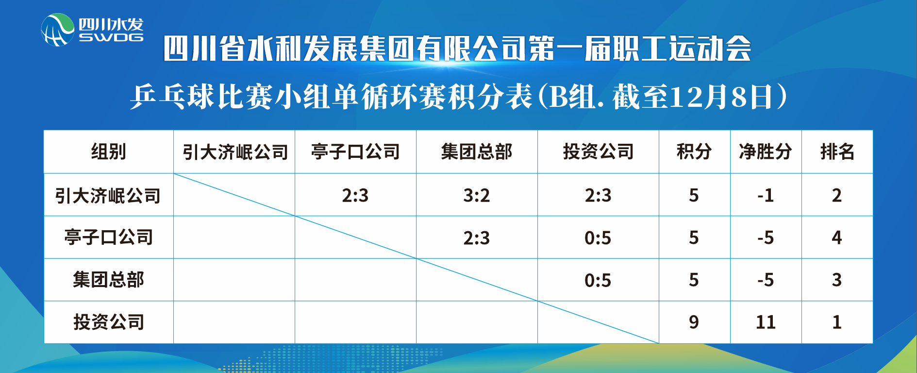 自12月5日運動會開賽至今,水發(fā)集團(tuán)首屆職工運動會第一階段的小組循環(huán)賽已全部結(jié)束。積分榜上,8支隊伍積分你追我趕。最終進(jìn)入決賽的隊伍分別是籃球(投資公司 VS 設(shè)計公司),乒乓球(投資公司 VS 設(shè)計公司),足球(集團(tuán)總部 VS 投資公司),羽毛球(投資公司 VS 設(shè)計公司)。