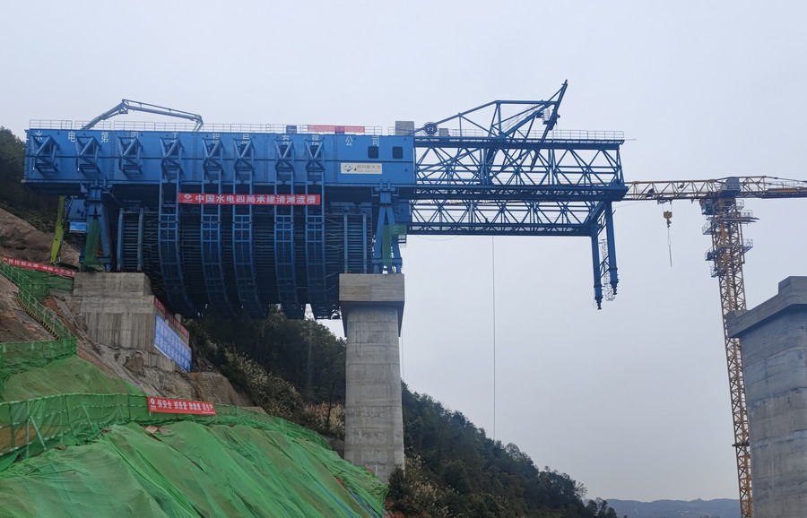 其中,進(jìn)口漸變段~3#墩為涉鐵交叉段,長(zhǎng)度115米,施工難度極大,為確保高空作業(yè)施工安全,經(jīng)專家多次論證,最終采用造槽機(jī)(移動(dòng)模架)施工,該造槽機(jī)獲得國家實(shí)用新型專利,如此高墩大跨度的渡槽建設(shè)規(guī)模位居國內(nèi)前列。此次開倉澆筑的槽身混凝土比原計(jì)劃提前5天完成,預(yù)計(jì)2024年7月底完成渡槽的施工任務(wù)。
