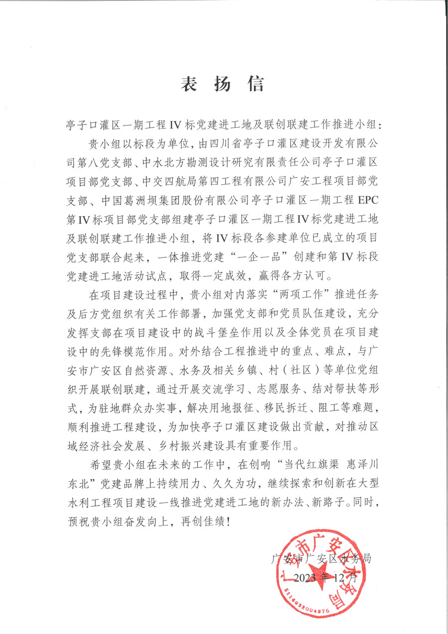 近日,亭子口灌區(qū)一期工程第Ⅳ標“黨建進工地”及聯創(chuàng)聯建工作推進小組收到廣安市廣安區(qū)水務局發(fā)來的表揚信,對企地共建取得的成效表示肯定。這是“黨建進工地”深化黨建引領重大工程建設,充分發(fā)揮參建單位黨組織引領作用,凝聚工作合力,破解工程建設難點難題,推動工程有序實施的具體體現。
