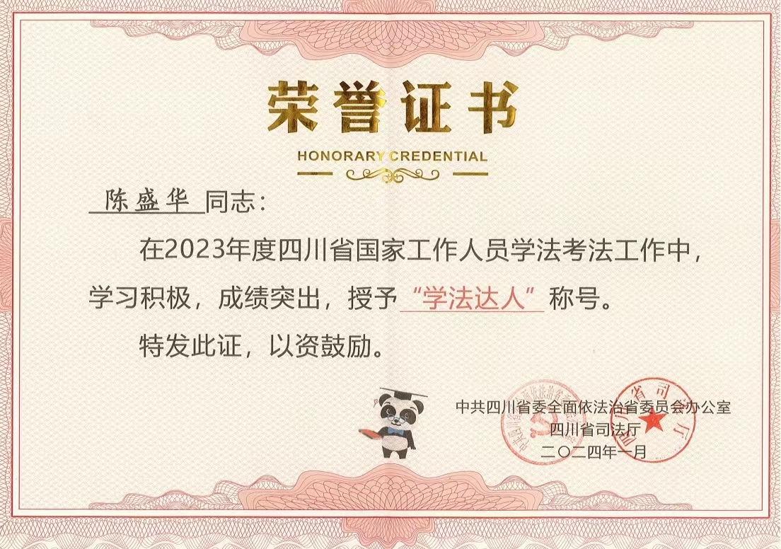 近日,中共四川省委全面依法治省委員會(huì)辦公室、四川省司法廳通報(bào)2023年度四川省國(guó)家工作人員學(xué)法考法工作情況,全省114.8萬(wàn)人參考,評(píng)出學(xué)法超過(guò)1000分且年度考法成績(jī)滿分的“學(xué)法達(dá)人”共1143名,其中建設(shè)公司陳盛華同志以位列全省企業(yè)類第3名的成績(jī)喜獲殊榮。