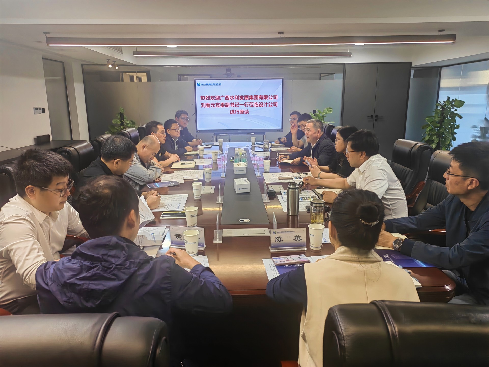 近日,廣西水利發(fā)展集團(tuán)有限公司黨委副書記、紀(jì)委書記、職工董事、工會(huì)主席劉春元一行蒞臨設(shè)計(jì)公司交流座談,廣西壯族自治區(qū)水利電力勘測(cè)設(shè)計(jì)研究院有限責(zé)任公司黨委書記、董事長、總經(jīng)理唐崗,黨委副書記、職工董事、工會(huì)主席歐輝明以及有關(guān)部門、分院負(fù)責(zé)人陪同參加。