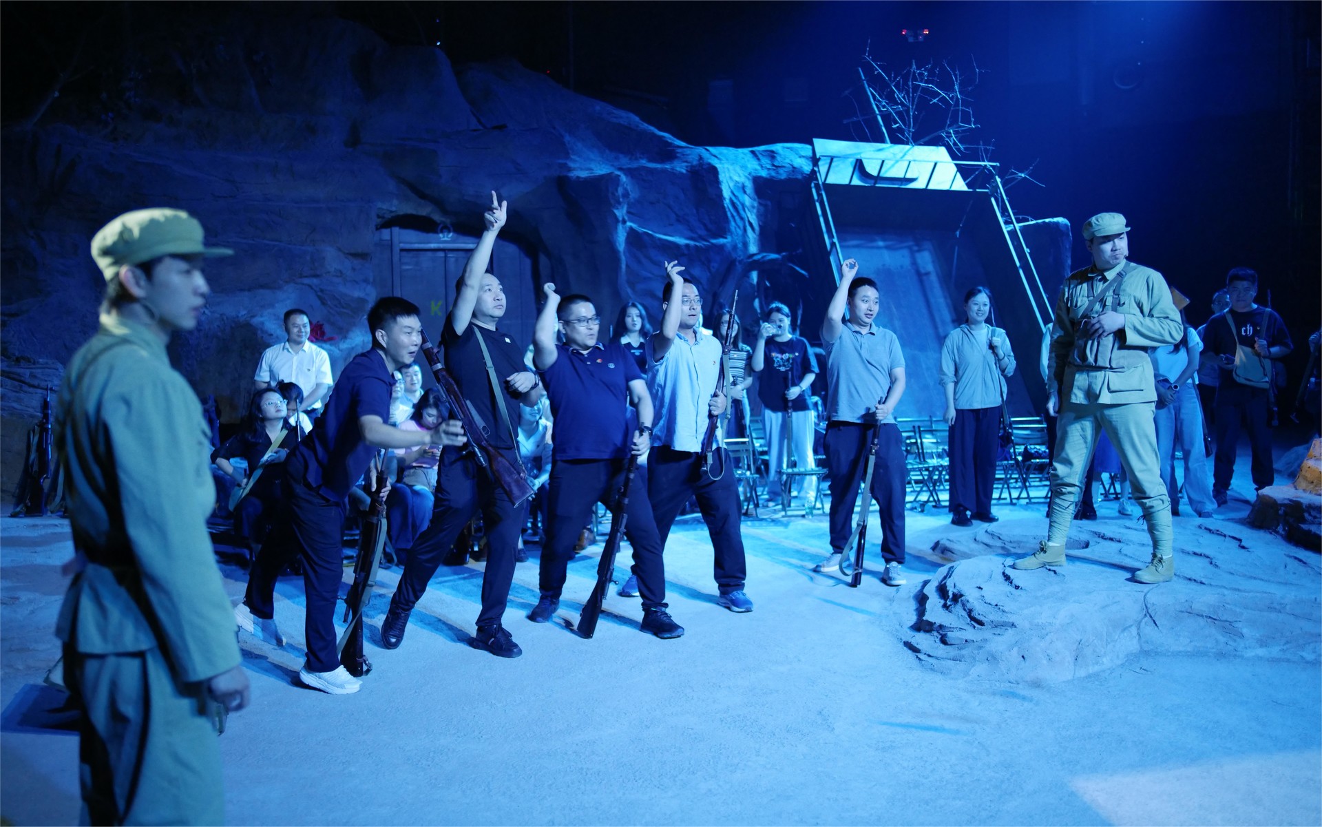“同志們,你們準(zhǔn)備好了嗎?”“準(zhǔn)備好啦!”參觀完紅色文化長(zhǎng)廊,大家整齊列隊(duì)進(jìn)入沉浸式劇場(chǎng),在充滿歷史感的環(huán)境中,駐足2024、回望1953。通過家鄉(xiāng)話別、寫家書、投擲手榴彈、坑道作戰(zhàn)、運(yùn)送物資等環(huán)節(jié)沉浸式體驗(yàn)硝煙彌漫的戰(zhàn)場(chǎng),先輩們的英勇事跡在全息影像中得以生動(dòng)還原,每一幀畫面都如同英雄的心跳,激發(fā)著黨員干部?jī)?nèi)心的無尚崇敬和愛國(guó)主義情懷。在虛擬與現(xiàn)實(shí)交融的舞臺(tái)上,大家觸摸歷史的脈搏,集體莊重許下弘揚(yáng)偉大抗美援朝精神建設(shè)四川水網(wǎng)的莊嚴(yán)承諾。
