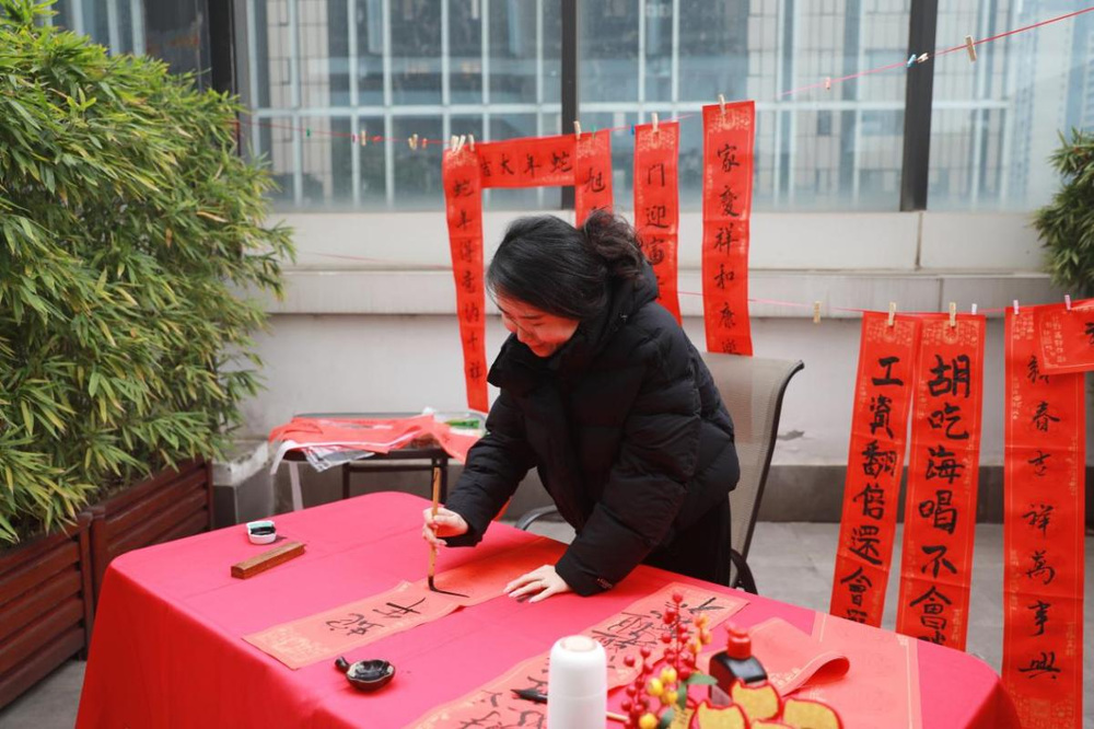 “迎春寫對聯(lián)”隨著職工書寫的鋪氈、蘸墨、揮毫,筆鋒一起一落,一幅幅對仗工整、寓意吉祥的春聯(lián)躍然紙上。